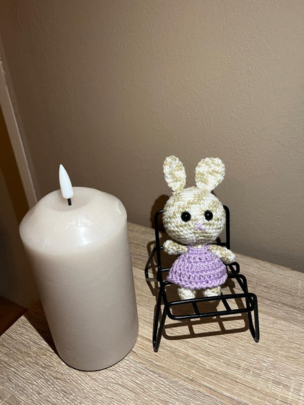 Am Ende hältst du deinen eigenen, selbstgemachten Amigurumi-Hasen in der Hand -bereit, deinen Schlüsselbund zu schmücken oder ein Lächeln zu verschenken.