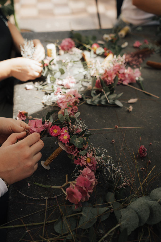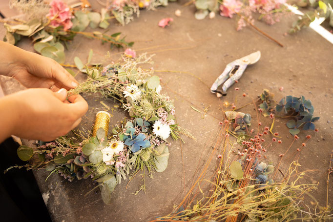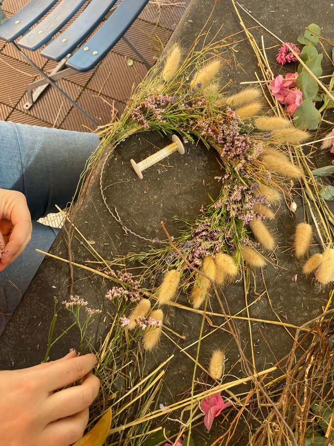 Wir arbeiten mit einer feinen Auswahl an getrockneten Blumen, Gräsern, Zweigen und anderen Naturmaterialien, die je nach Saison variieren. Auch zarte Duftnoten – etwa durch ausgewählte Kräuter oder Blüten – begleiten dich durch den kreativen Prozess.